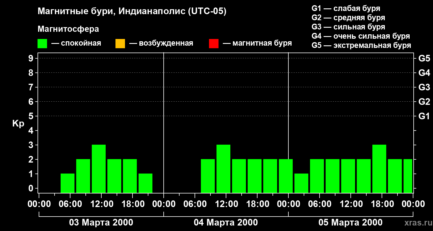 Изменения геомагнитного индекса Kp с 3 по 5 марта 2000 года для средних широт