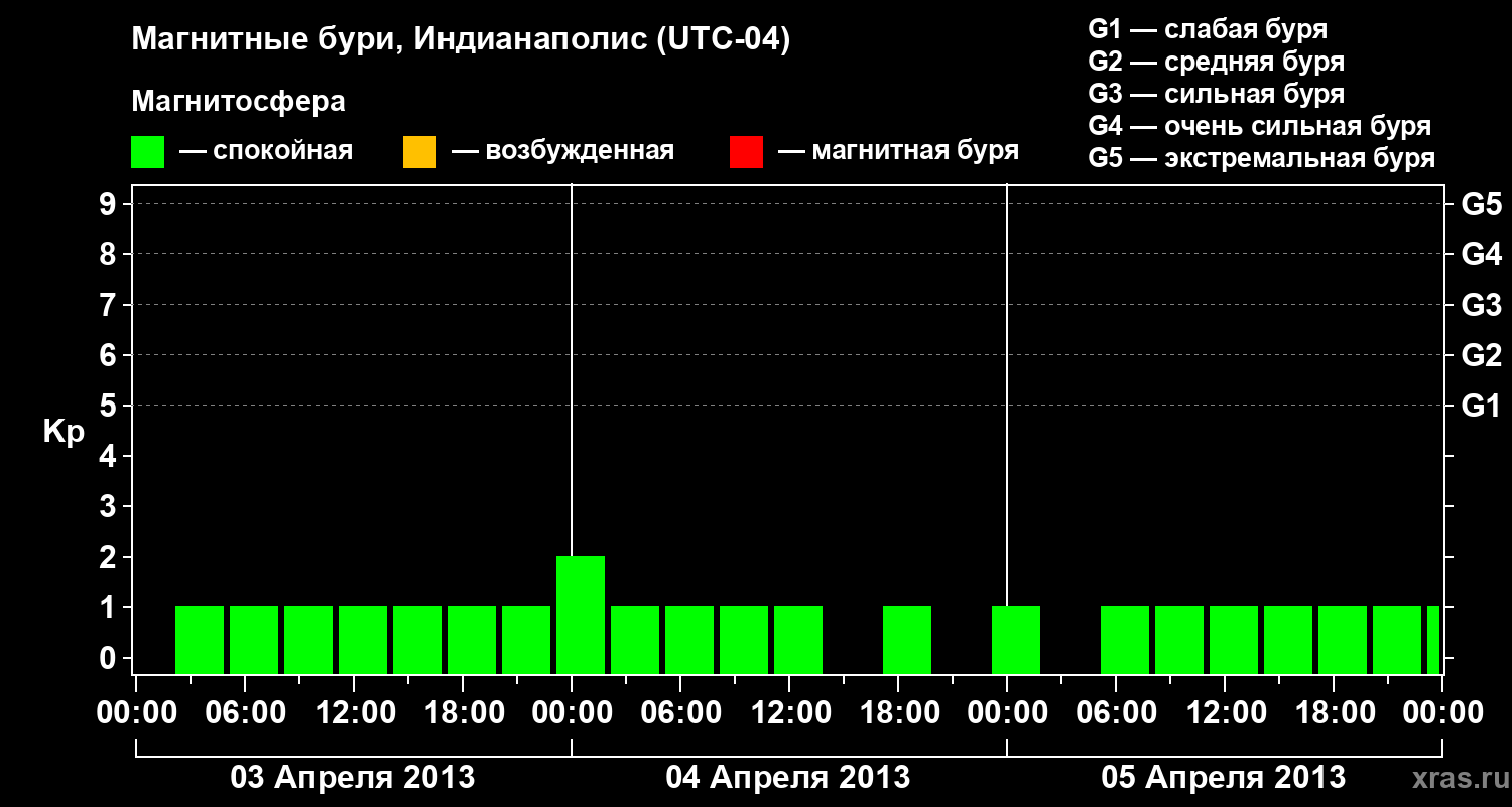 Изменения геомагнитного индекса Kp с 3 по 5 апреля 2013 года для средних широт