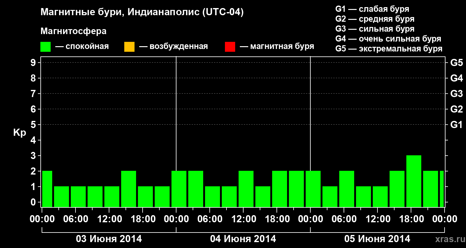 Изменения геомагнитного индекса Kp с 3 по 5 июня 2014 года для средних широт