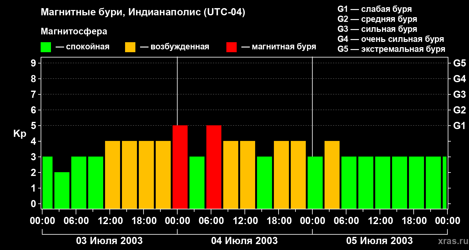 Изменения геомагнитного индекса Kp с 3 по 5 июля 2003 года для средних широт