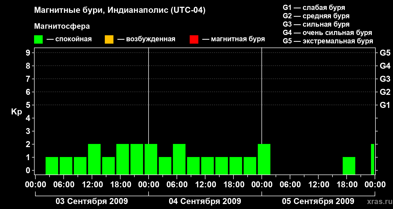 Изменения геомагнитного индекса Kp с 3 по 5 сентября 2009 года для средних широт