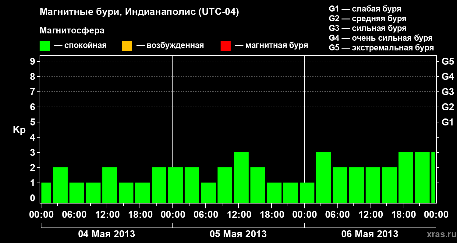 Изменения геомагнитного индекса Kp с 4 по 6 мая 2013 года для средних широт