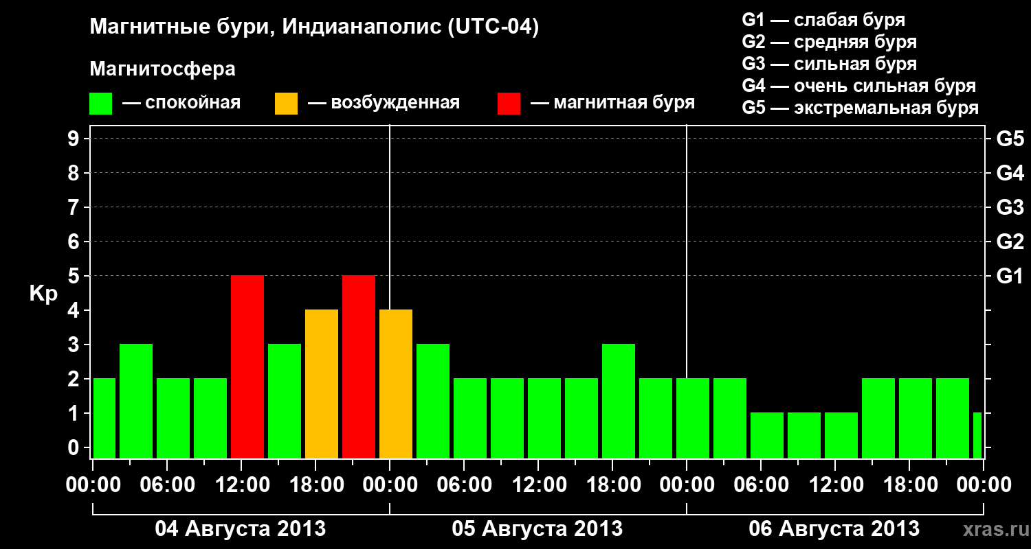 Изменения геомагнитного индекса Kp с 4 по 6 августа 2013 года для средних широт