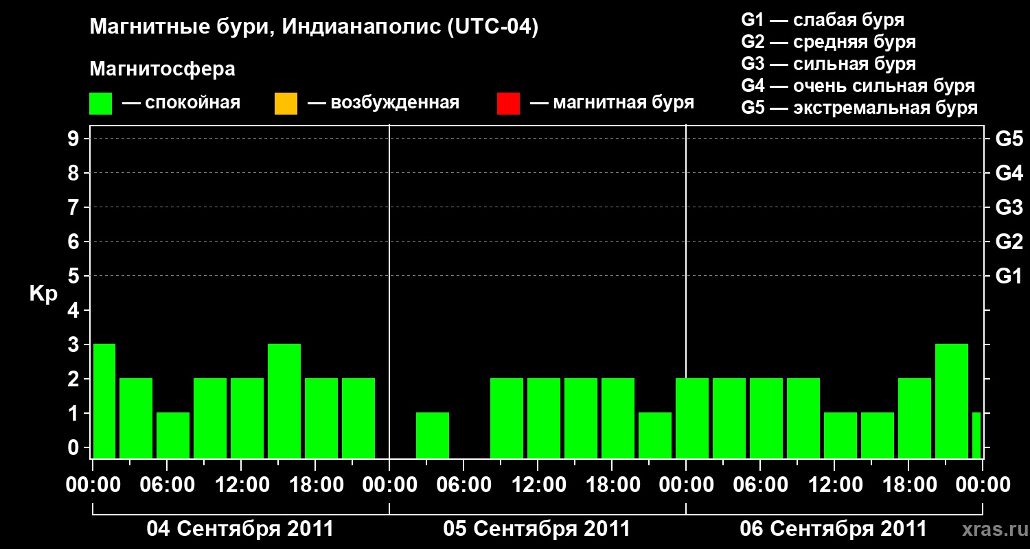 Изменения геомагнитного индекса Kp с 4 по 6 сентября 2011 года для средних широт