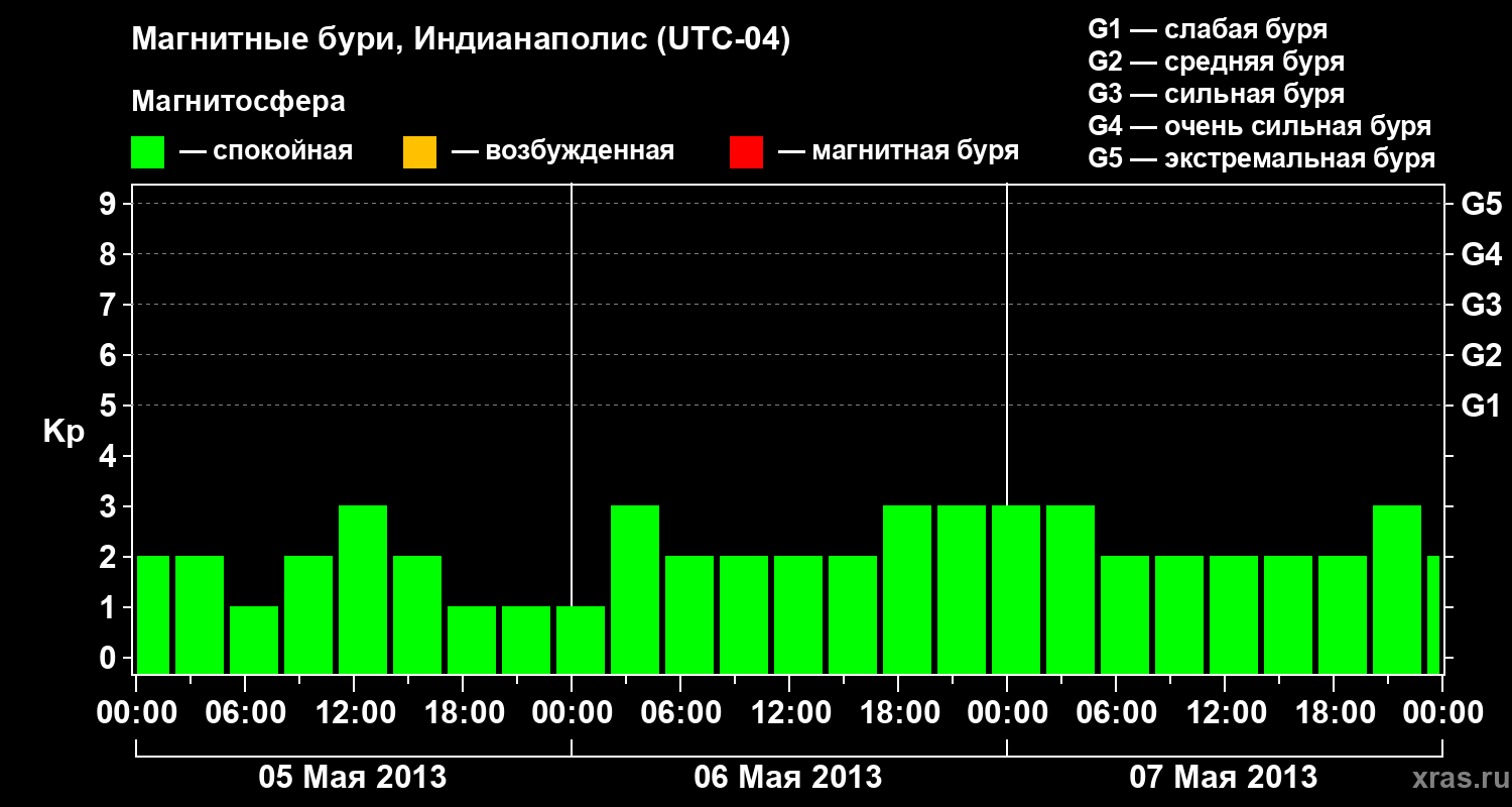 Изменения геомагнитного индекса Kp с 5 по 7 мая 2013 года для средних широт