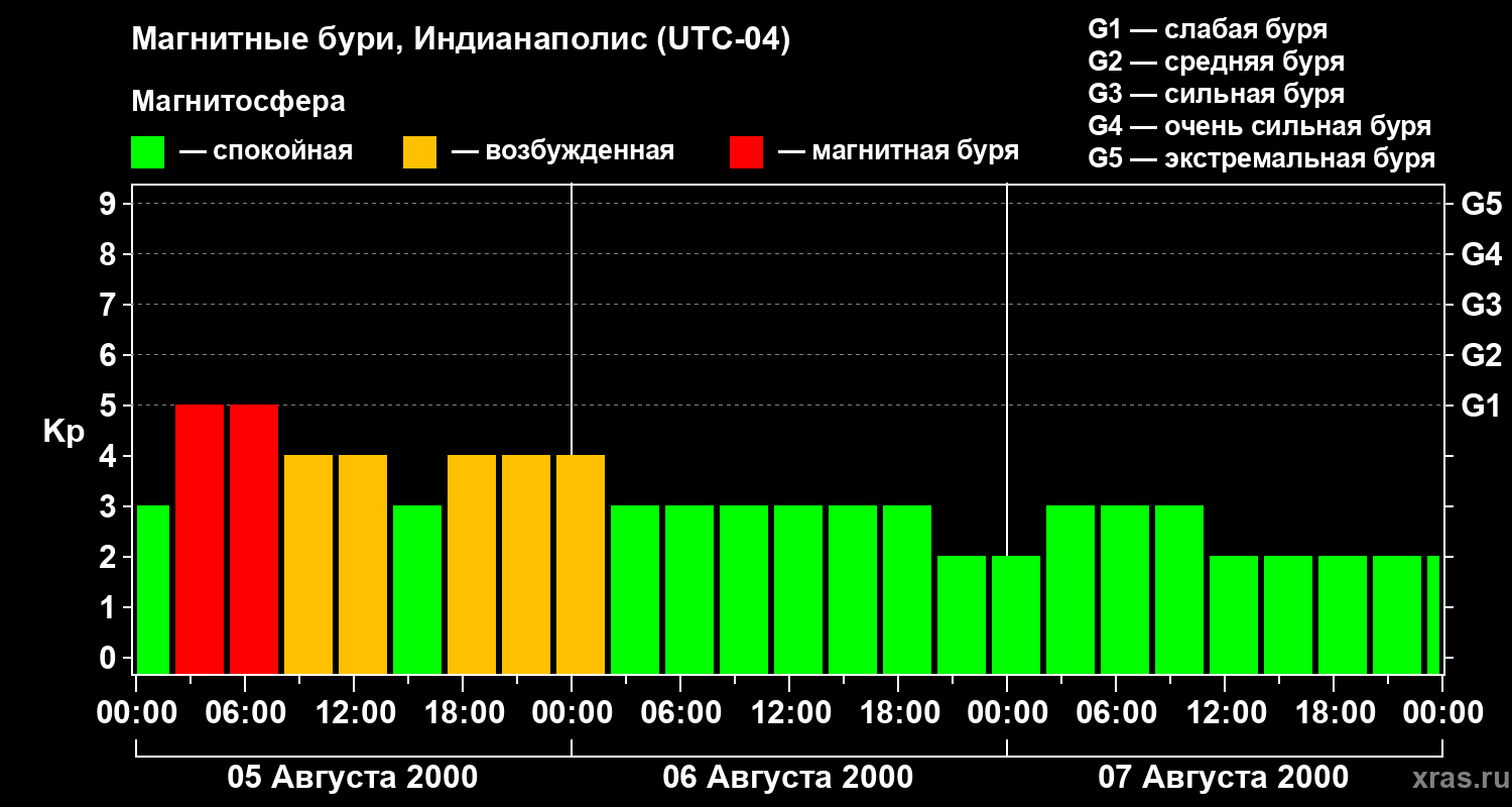 Изменения геомагнитного индекса Kp с 5 по 7 августа 2000 года для средних широт