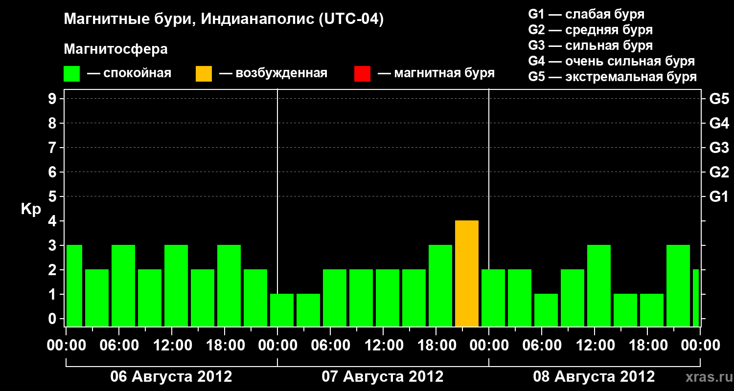 Изменения геомагнитного индекса Kp с 6 по 8 августа 2012 года для средних широт