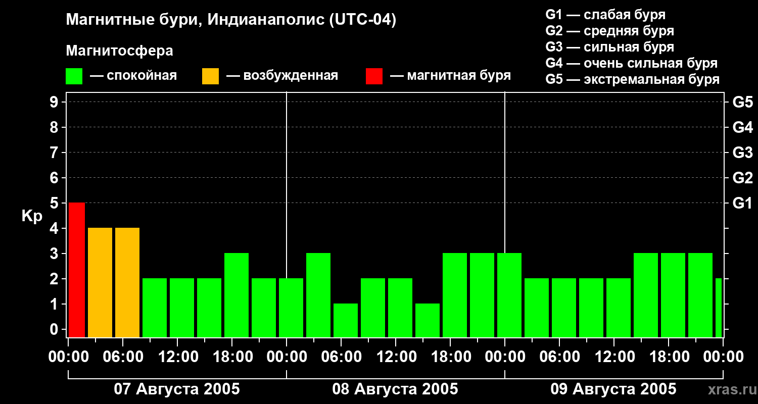 Изменения геомагнитного индекса Kp с 7 по 9 августа 2005 года для средних широт