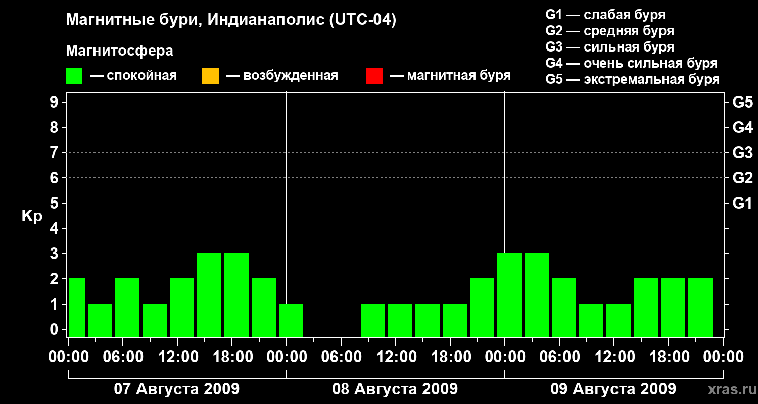 Изменения геомагнитного индекса Kp с 7 по 9 августа 2009 года для средних широт