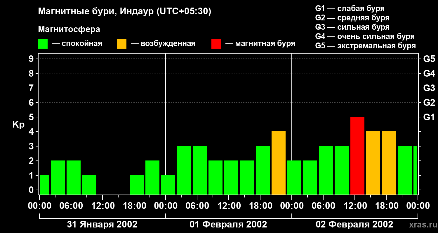 Изменения геомагнитного индекса Kp с 31 января по 2 февраля 2002 года для средних широт