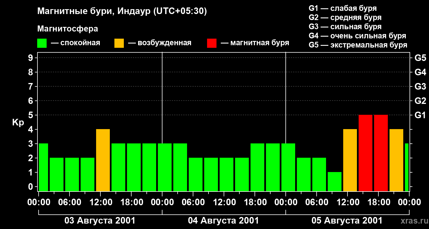 Изменения геомагнитного индекса Kp с 3 по 5 августа 2001 года для средних широт