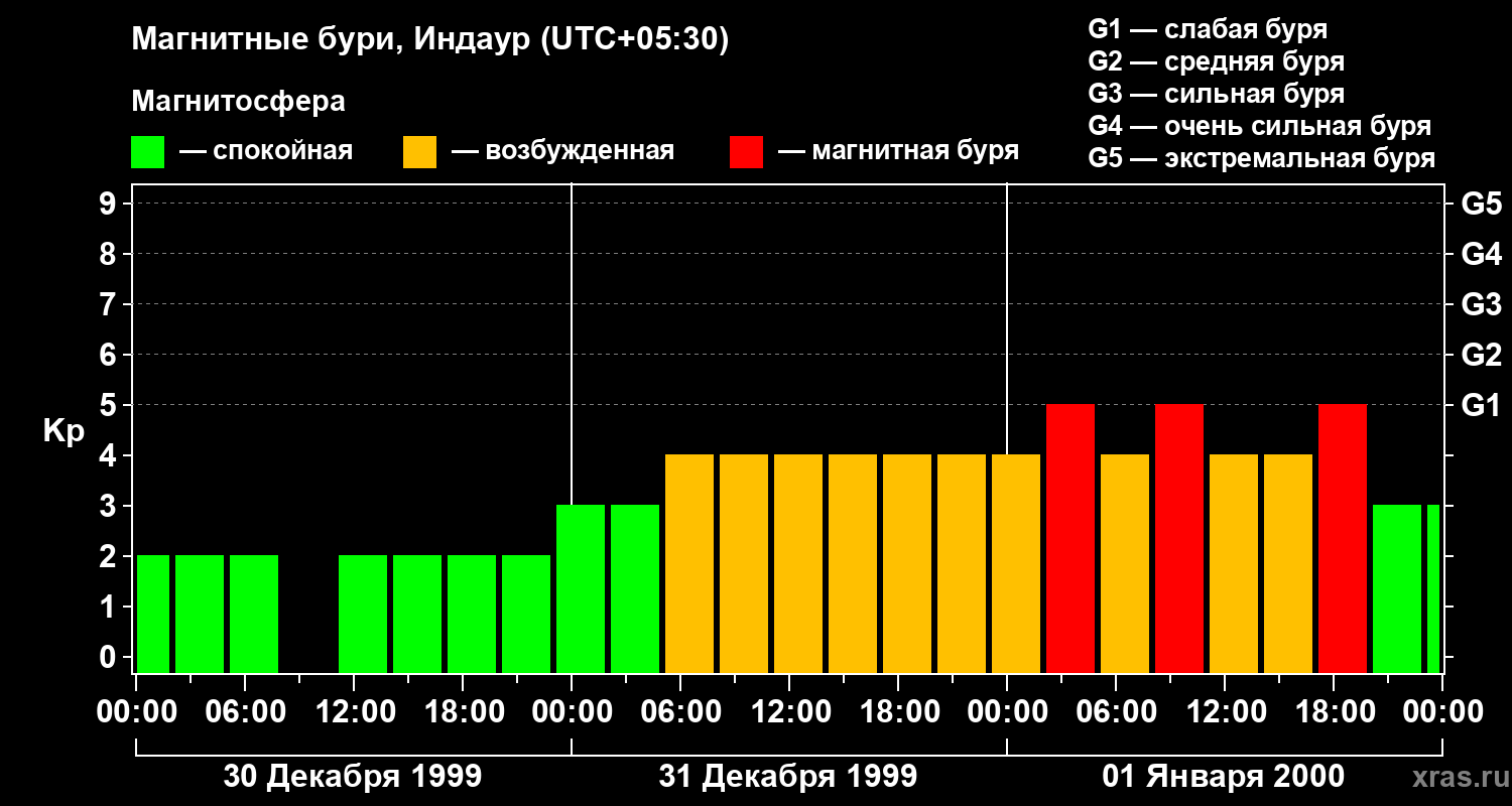 Изменения геомагнитного индекса Kp с 30 декабря 1999 года по 1 января 2000 года для средних широт