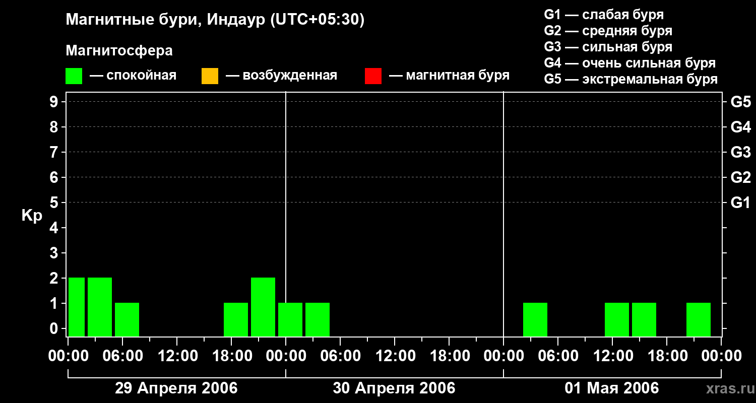 Изменения геомагнитного индекса Kp с 29 апреля по 1 мая 2006 года для средних широт