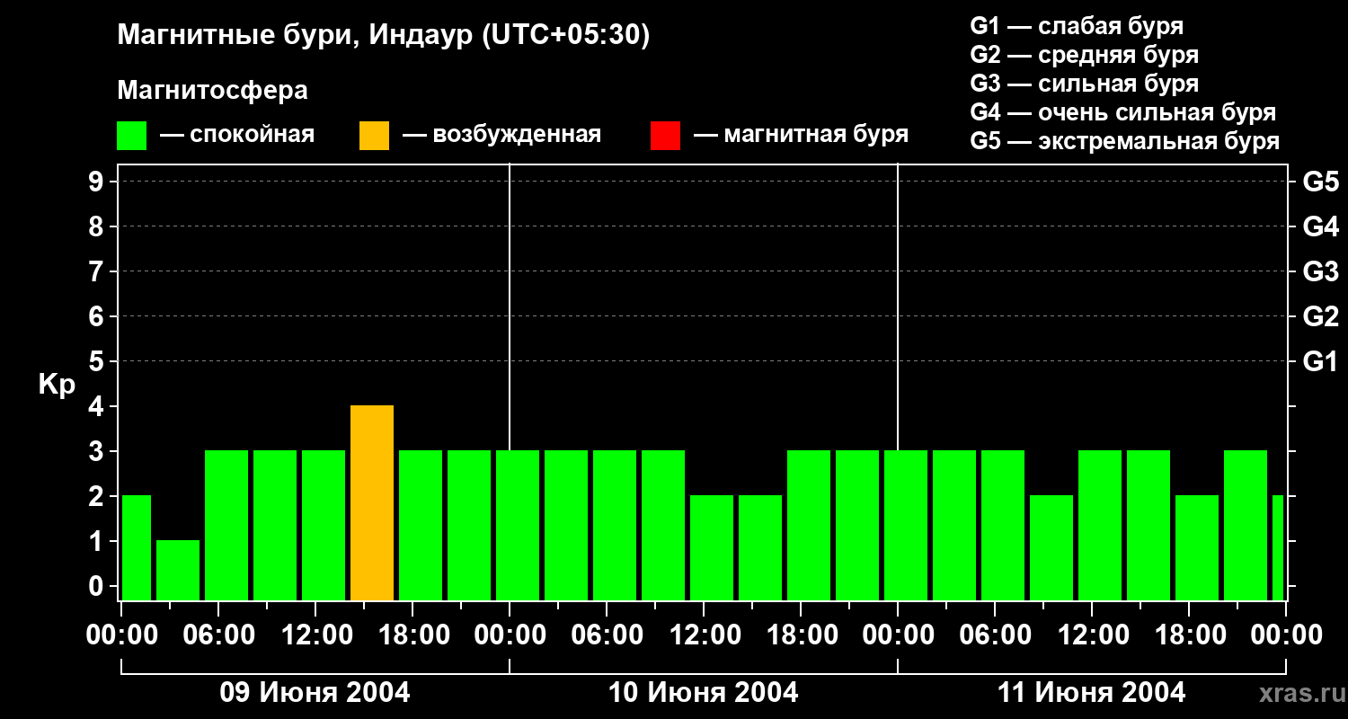 Изменения геомагнитного индекса Kp с 9 по 11 июня 2004 года для средних широт