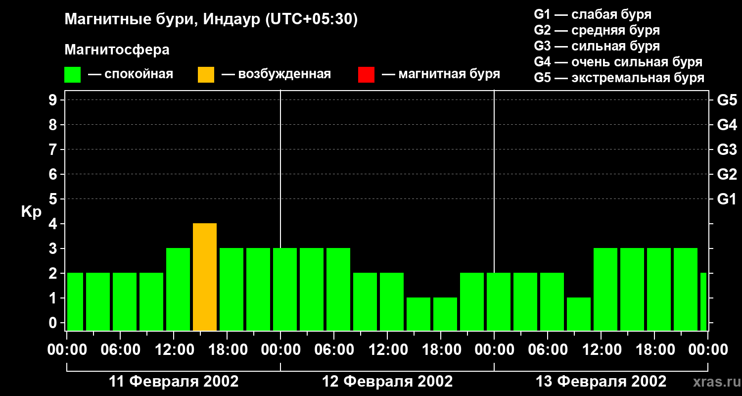 Изменения геомагнитного индекса Kp с 11 по 13 февраля 2002 года для средних широт