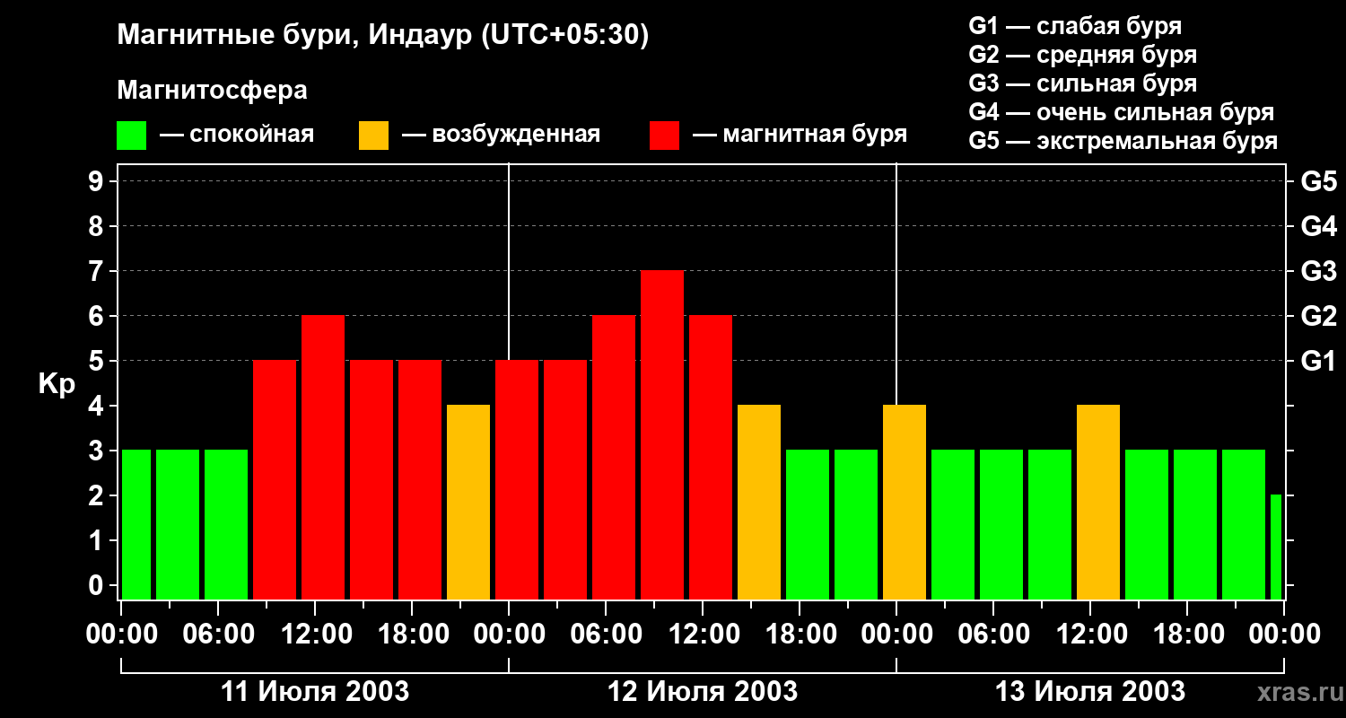 Изменения геомагнитного индекса Kp с 11 по 13 июля 2003 года для средних широт