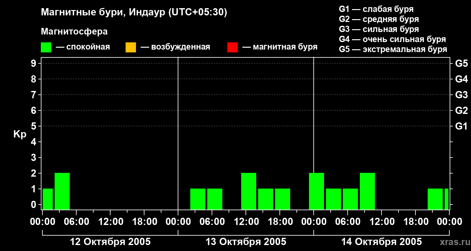 Изменения геомагнитного индекса Kp с 12 по 14 октября 2005 года для средних широт