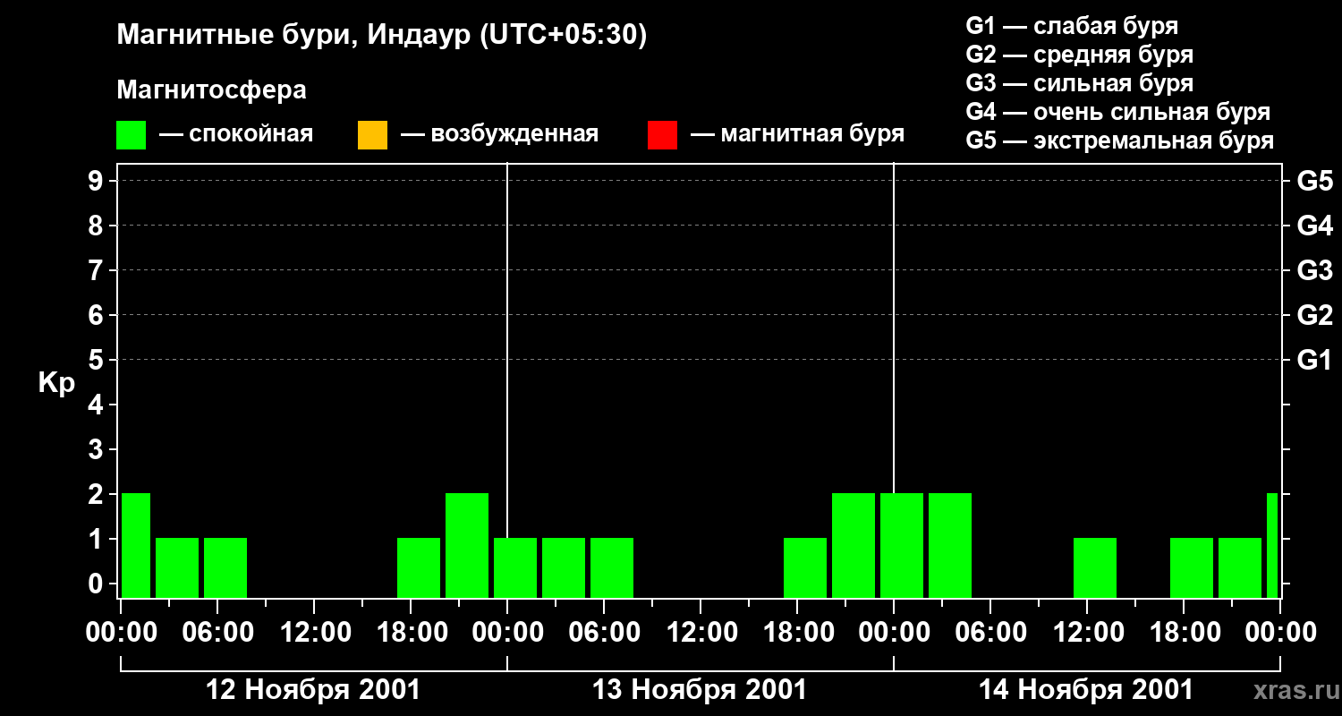 Изменения геомагнитного индекса Kp с 12 по 14 ноября 2001 года для средних широт