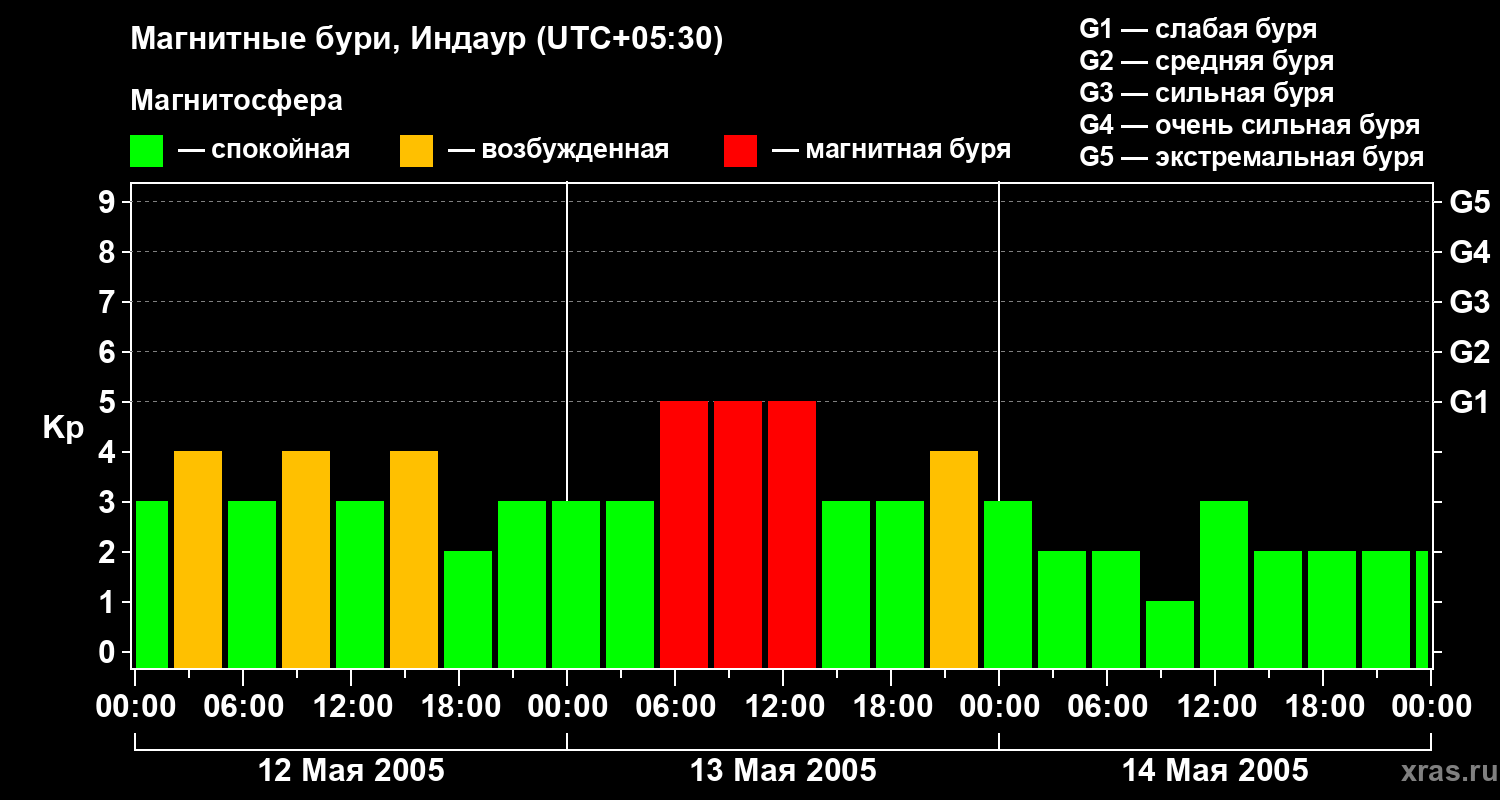 Изменения геомагнитного индекса Kp с 12 по 14 мая 2005 года для средних широт