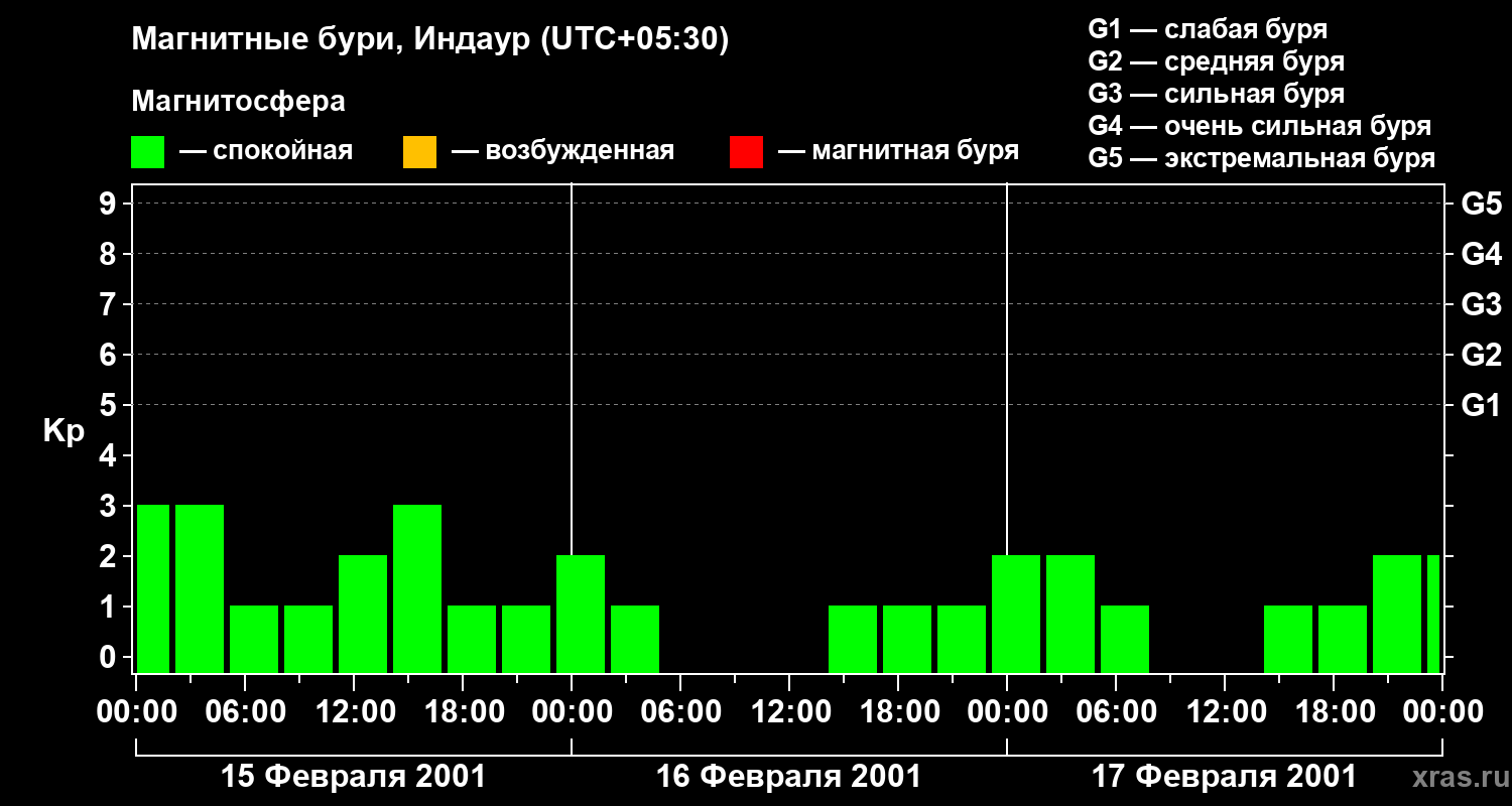 Изменения геомагнитного индекса Kp с 15 по 17 февраля 2001 года для средних широт