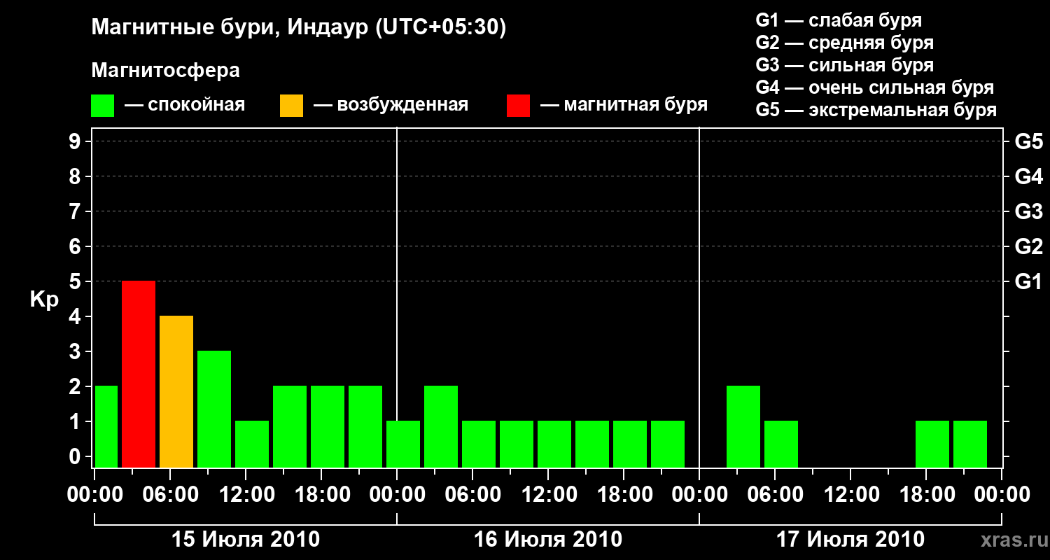 Изменения геомагнитного индекса Kp с 15 по 17 июля 2010 года для средних широт