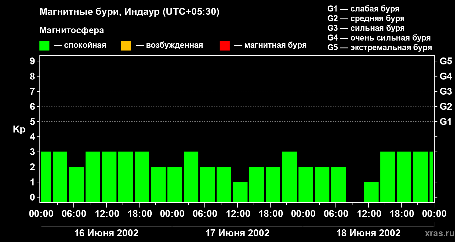 Изменения геомагнитного индекса Kp с 16 по 18 июня 2002 года для средних широт