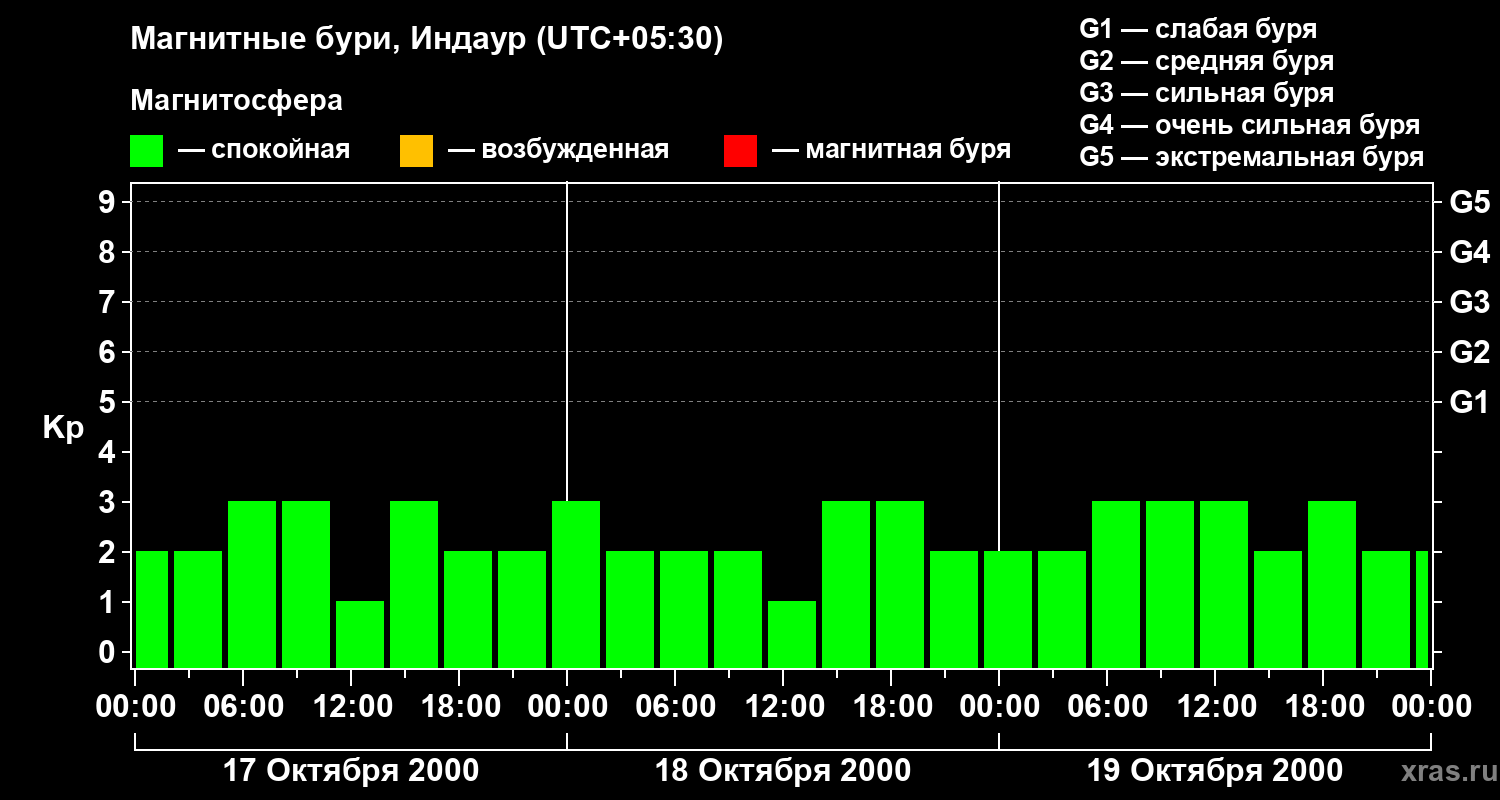 Изменения геомагнитного индекса Kp с 17 по 19 октября 2000 года для средних широт