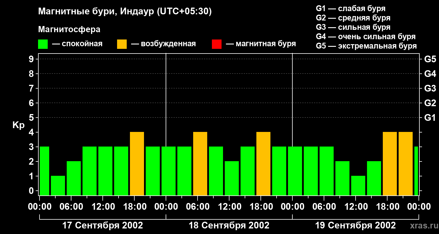Изменения геомагнитного индекса Kp с 17 по 19 сентября 2002 года для средних широт