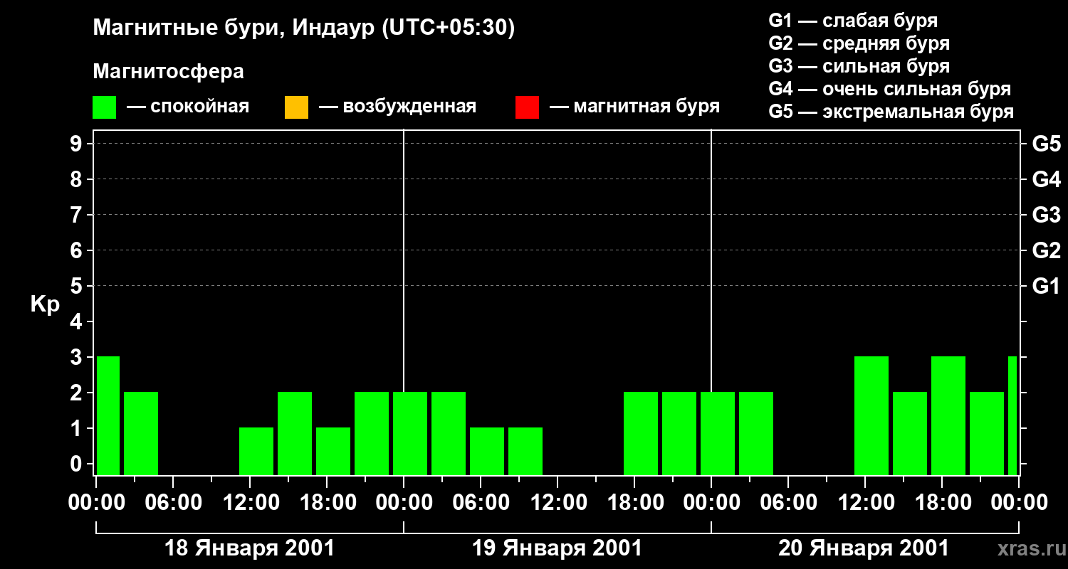 Изменения геомагнитного индекса Kp с 18 по 20 января 2001 года для средних широт