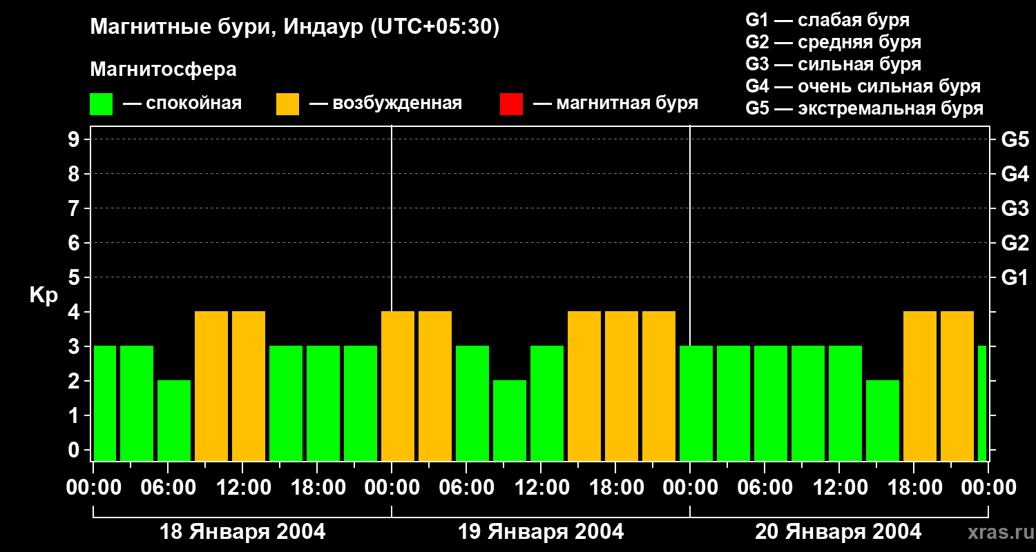 Изменения геомагнитного индекса Kp с 18 по 20 января 2004 года для средних широт