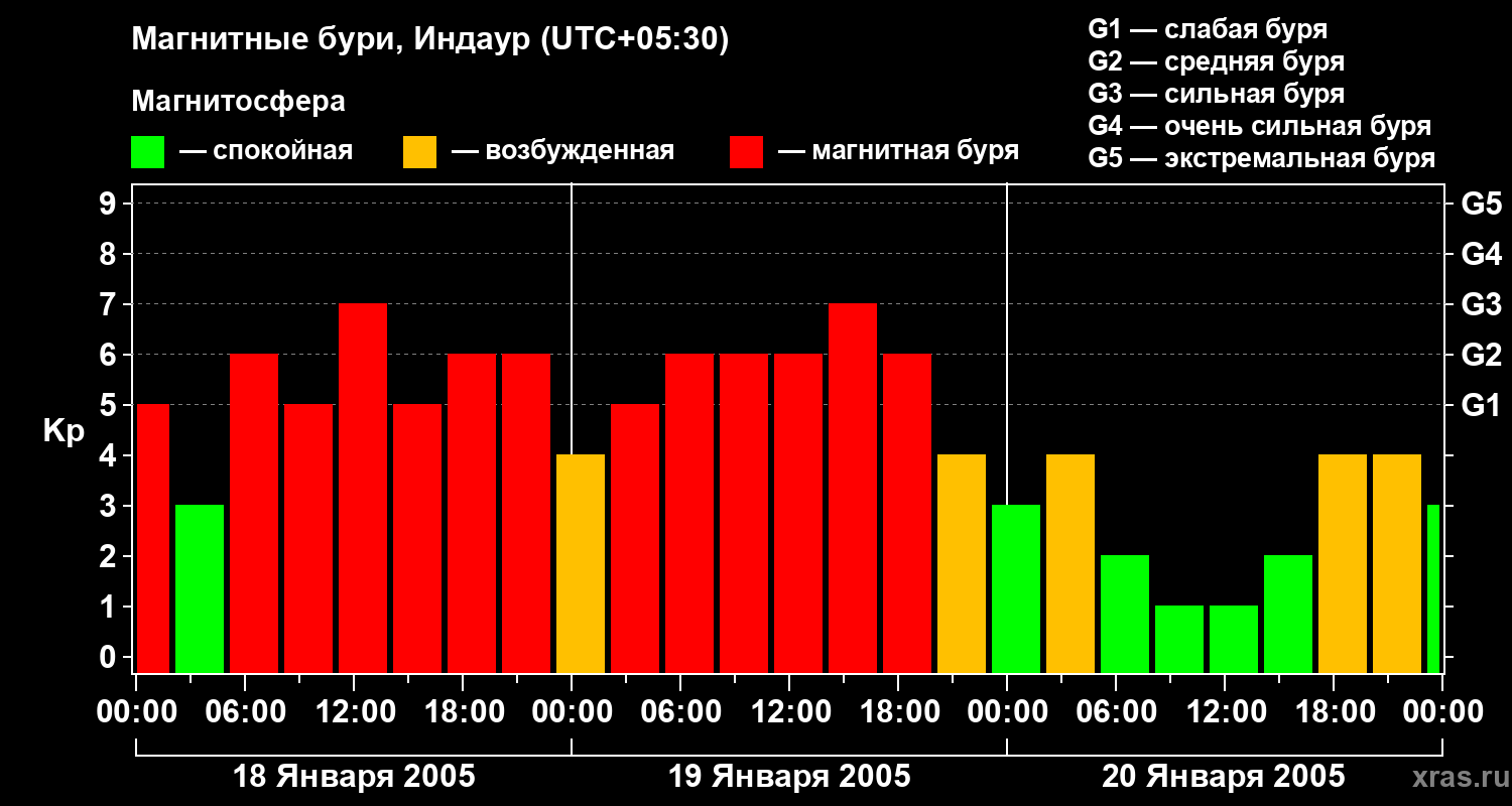 Изменения геомагнитного индекса Kp с 18 по 20 января 2005 года для средних широт