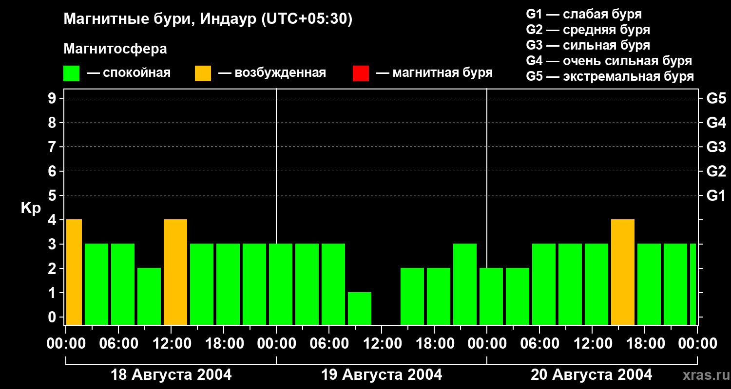 Изменения геомагнитного индекса Kp с 18 по 20 августа 2004 года для средних широт