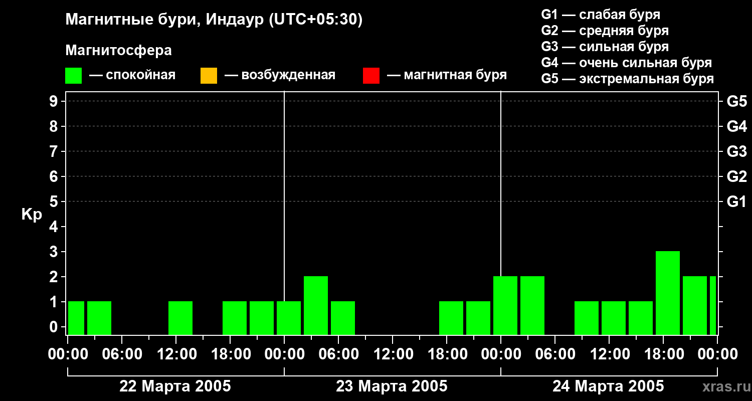 Изменения геомагнитного индекса Kp с 22 по 24 марта 2005 года для средних широт