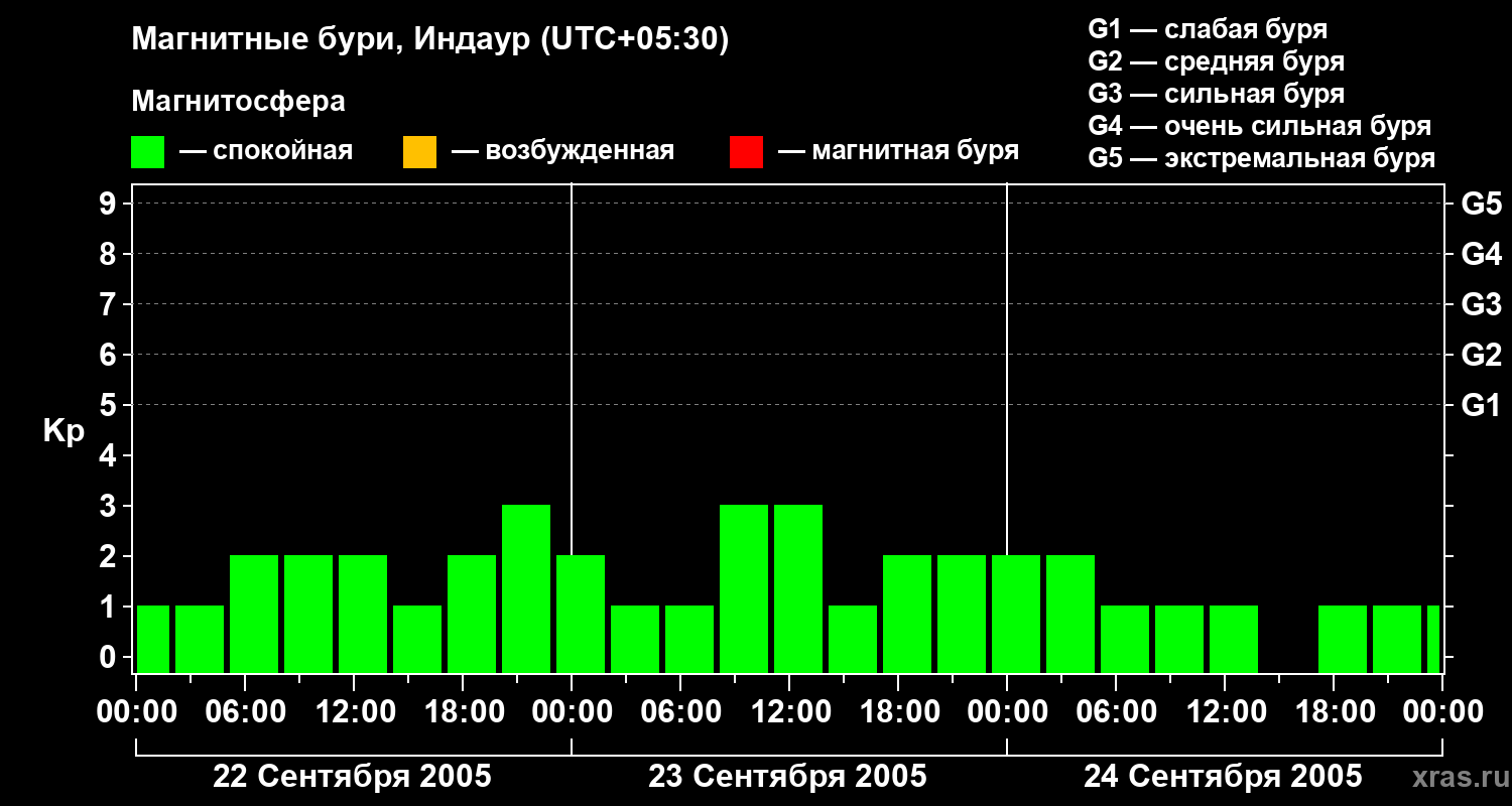 Изменения геомагнитного индекса Kp с 22 по 24 сентября 2005 года для средних широт