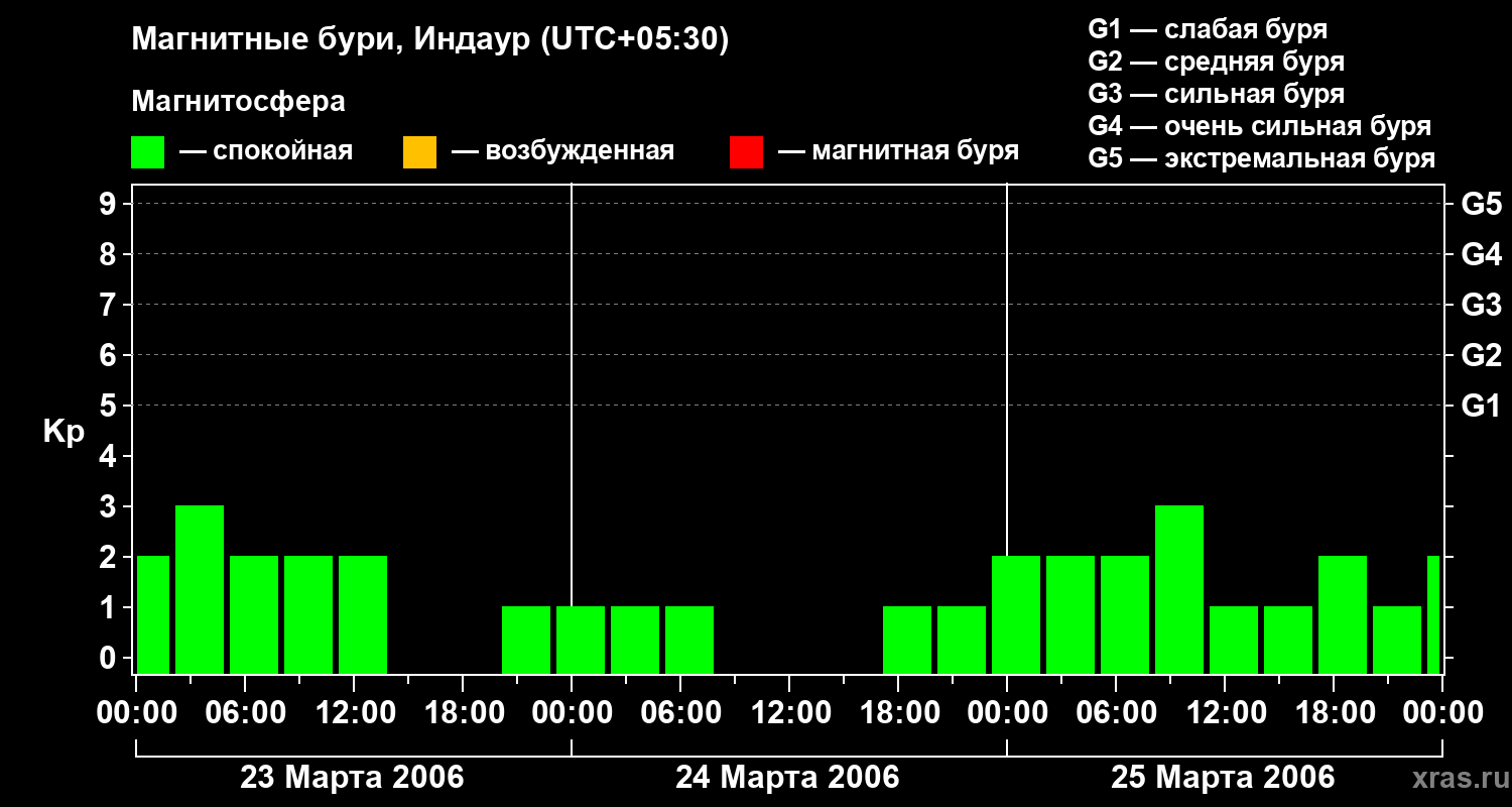 Изменения геомагнитного индекса Kp с 23 по 25 марта 2006 года для средних широт