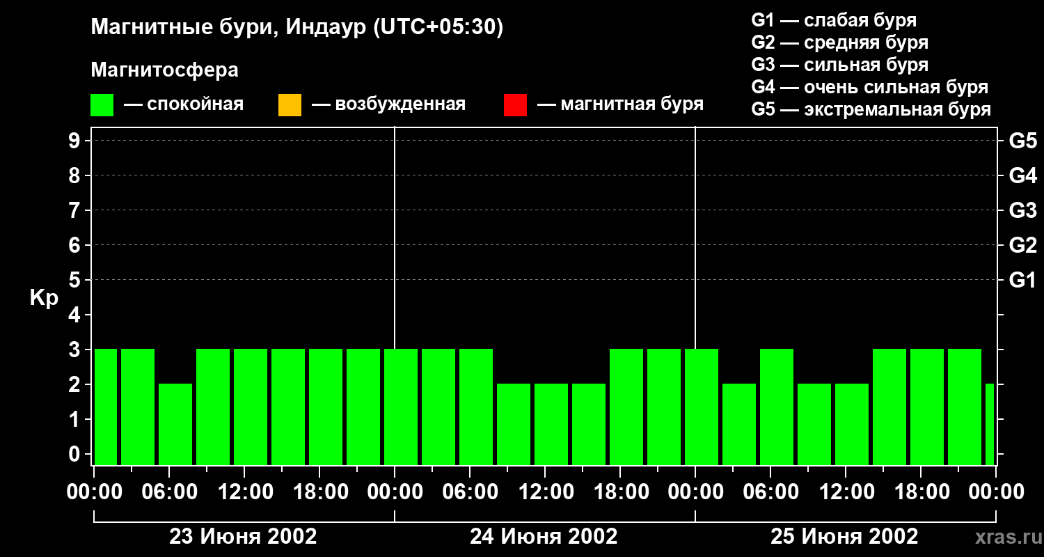 Изменения геомагнитного индекса Kp с 23 по 25 июня 2002 года для средних широт