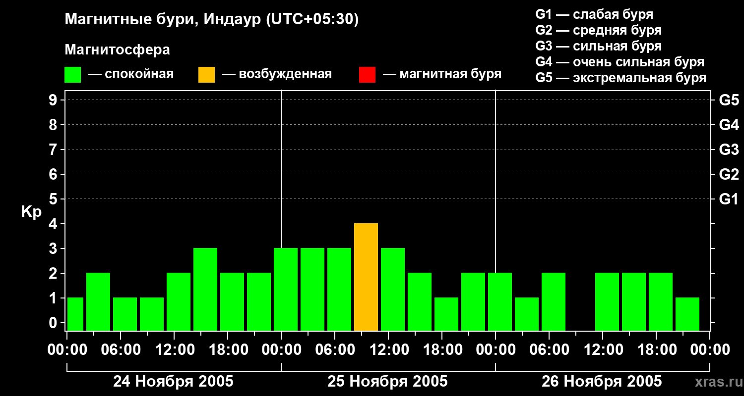 Изменения геомагнитного индекса Kp с 24 по 26 ноября 2005 года для средних широт