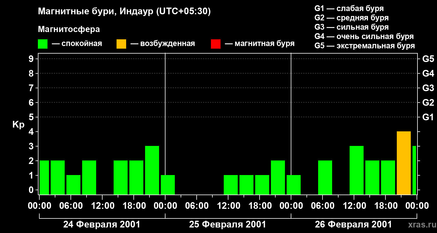 Изменения геомагнитного индекса Kp с 24 по 26 февраля 2001 года для средних широт