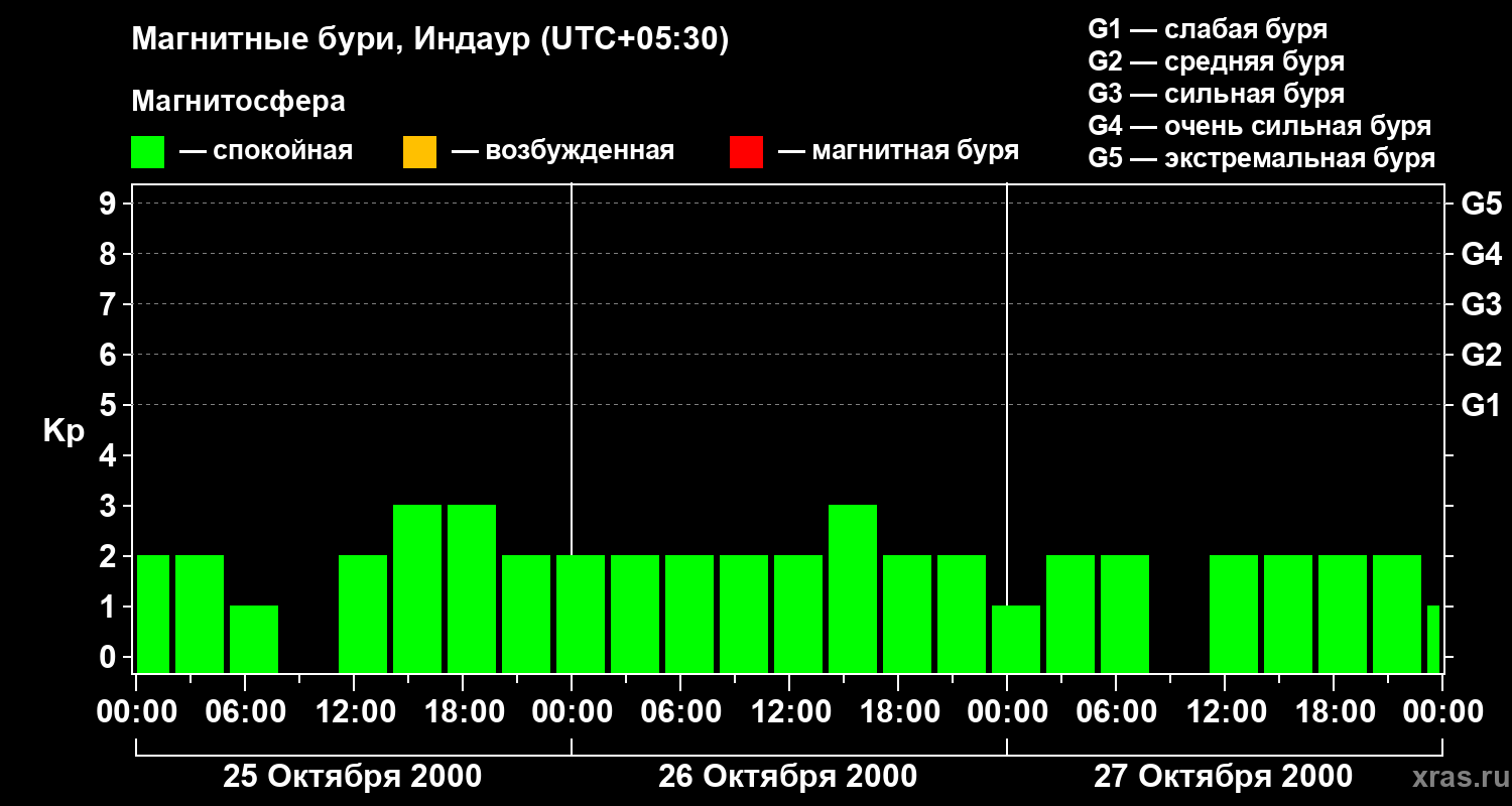 Изменения геомагнитного индекса Kp с 25 по 27 октября 2000 года для средних широт