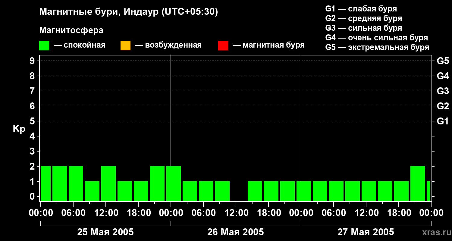 Изменения геомагнитного индекса Kp с 25 по 27 мая 2005 года для средних широт