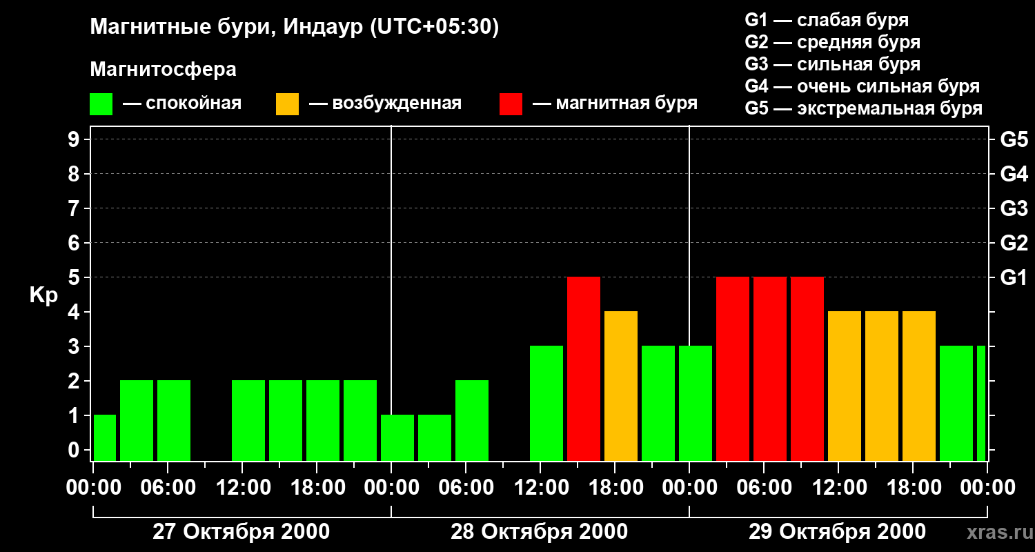 Изменения геомагнитного индекса Kp с 27 по 29 октября 2000 года для средних широт