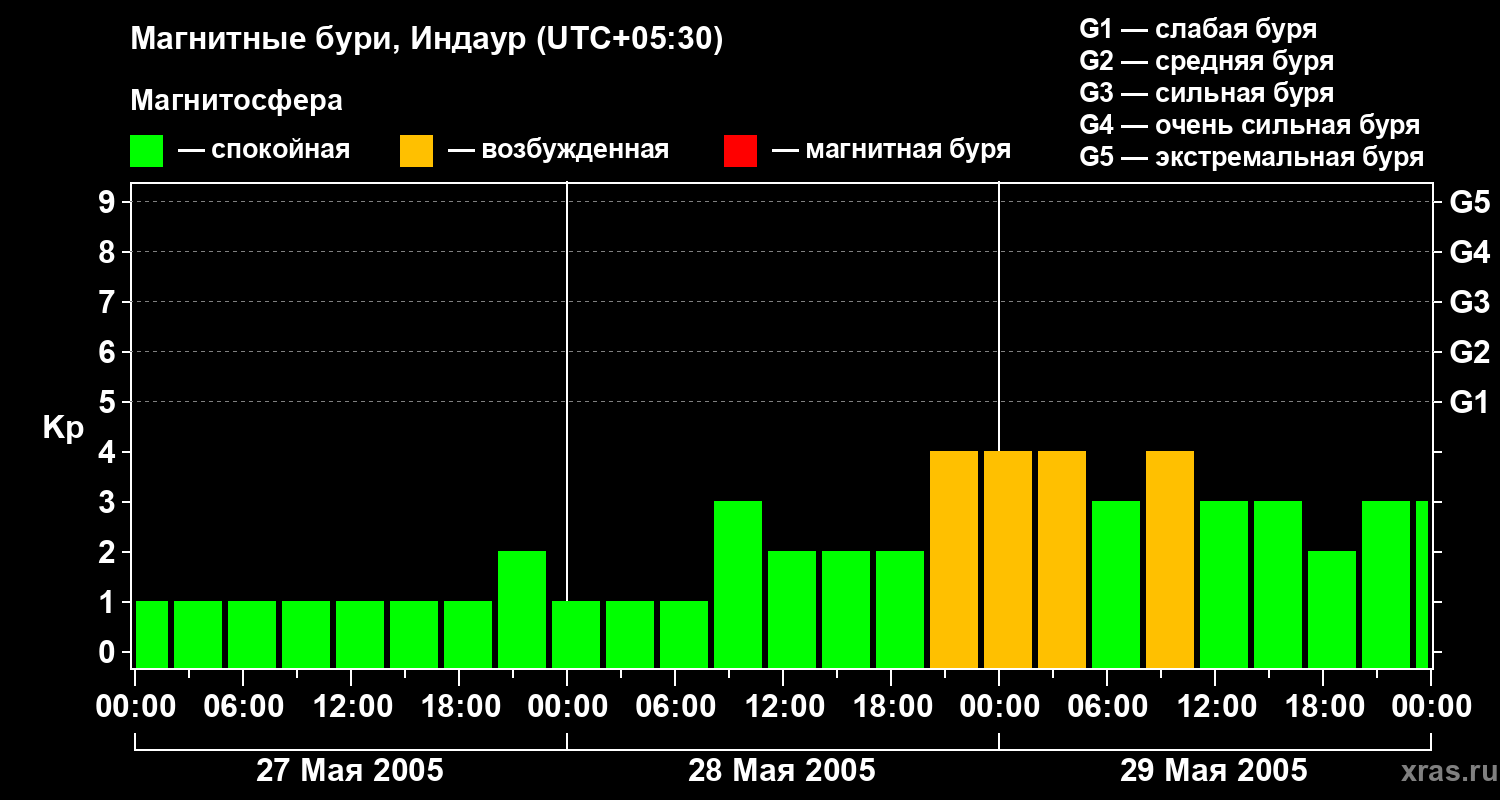 Изменения геомагнитного индекса Kp с 27 по 29 мая 2005 года для средних широт