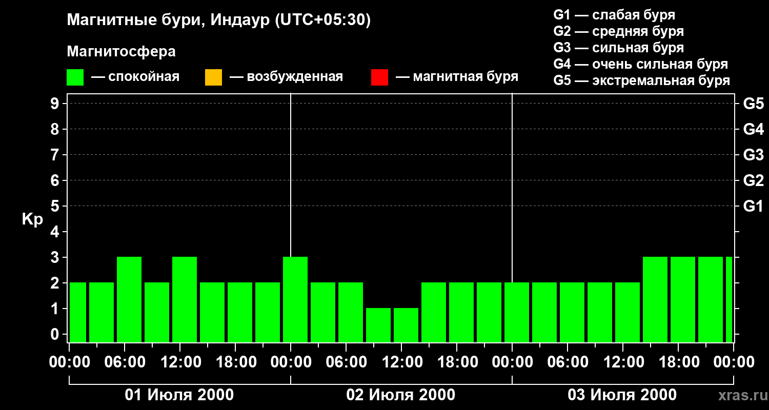 Изменения геомагнитного индекса Kp с 1 по 3 июля 2000 года для средних широт