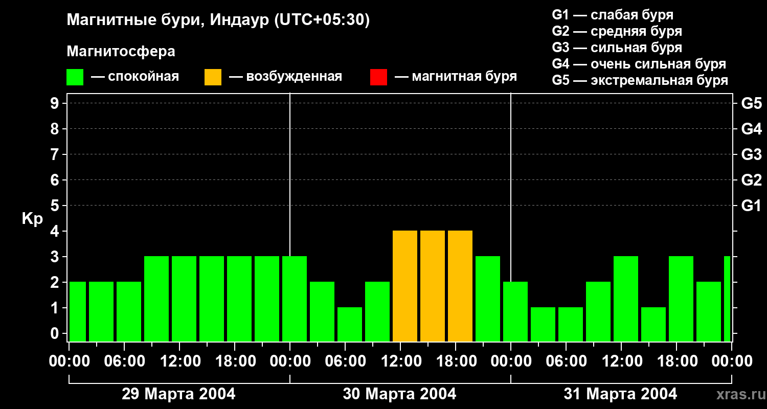 Изменения геомагнитного индекса Kp с 29 по 31 марта 2004 года для средних широт