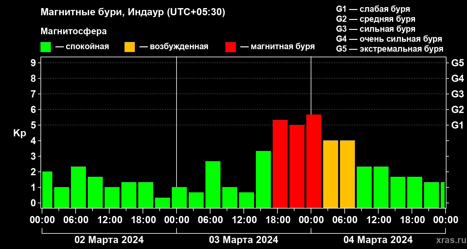 Изменения геомагнитного индекса Kp с 2 по 4 марта 2024 года для средних широт