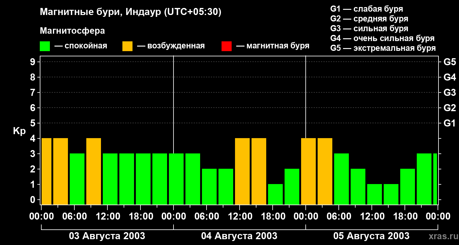 Изменения геомагнитного индекса Kp с 3 по 5 августа 2003 года для средних широт