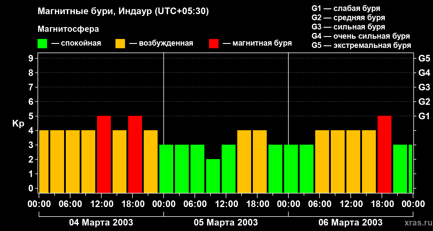 Изменения геомагнитного индекса Kp с 4 по 6 марта 2003 года для средних широт