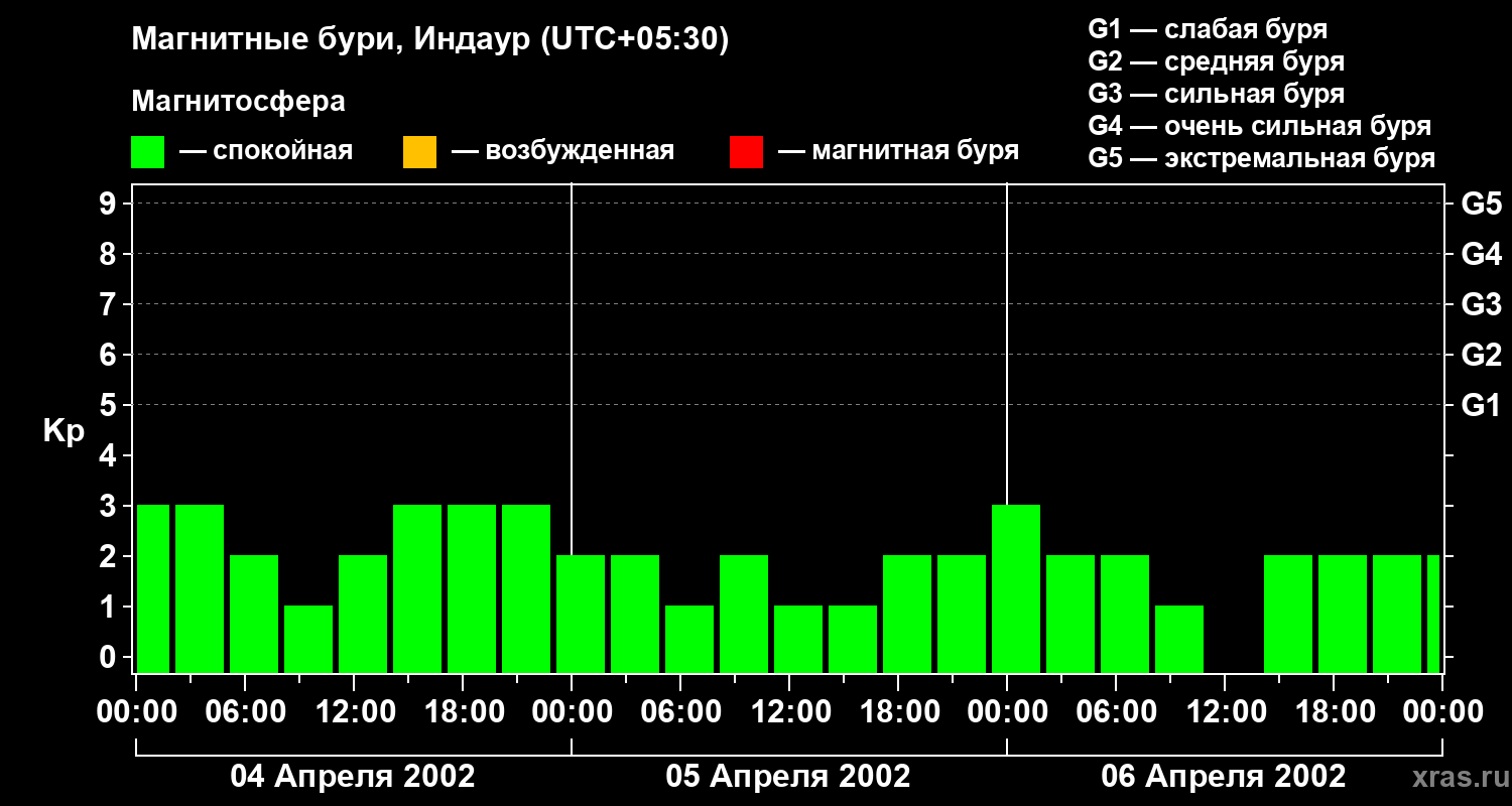Изменения геомагнитного индекса Kp с 4 по 6 апреля 2002 года для средних широт
