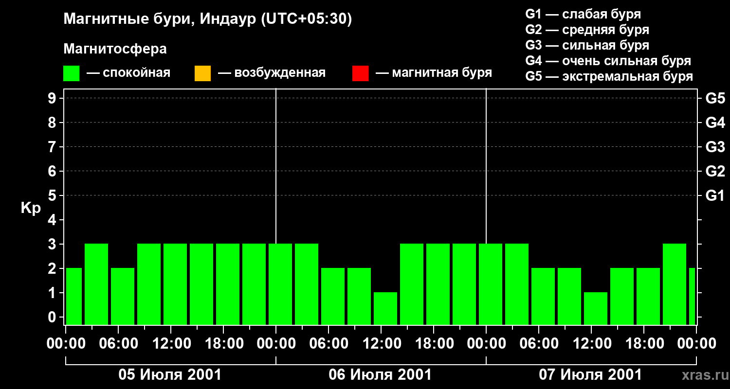 Изменения геомагнитного индекса Kp с 5 по 7 июля 2001 года для средних широт