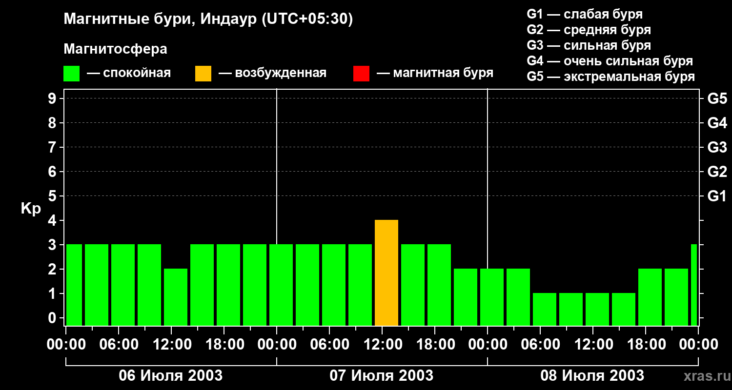Изменения геомагнитного индекса Kp с 6 по 8 июля 2003 года для средних широт